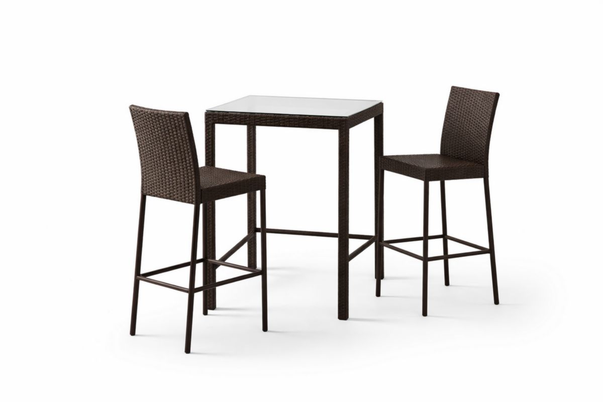 Set tavolo da bar in polyrattan con piano in vetro temperato e sgabelli imbottiti