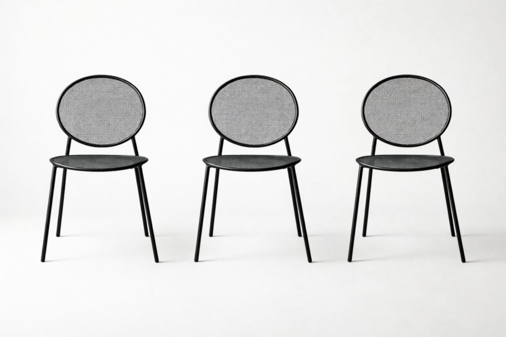 Set di 3 Sedie in Metallo Nero con Schienale Tondo in Rete Metallica