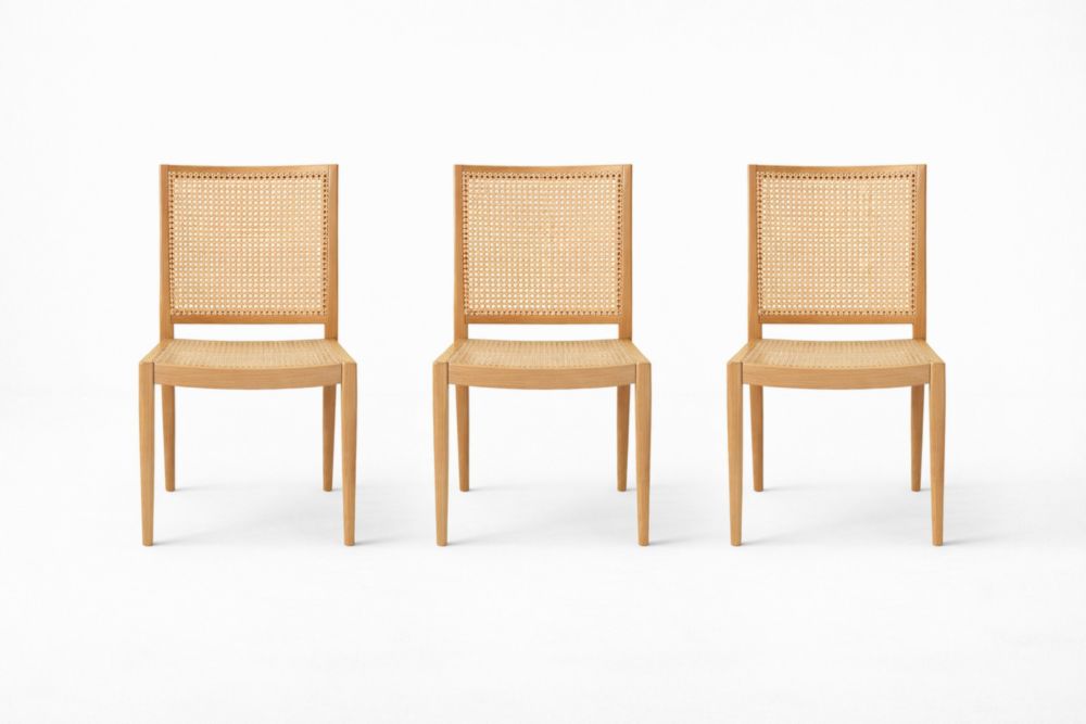 Set di 3 Sedie in Legno con Schienale in Rattan