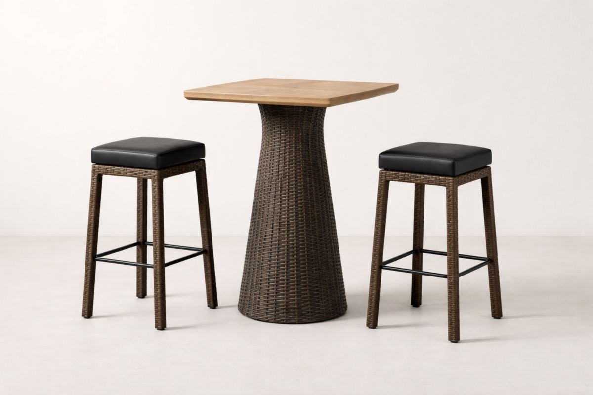 Set tavolo da bar quadrato in legno teak con 2 sgabelli in rattan e seduta in PU nero